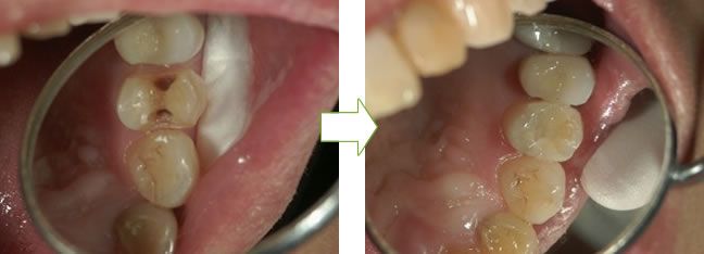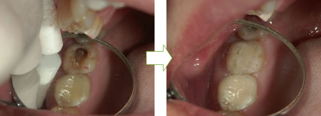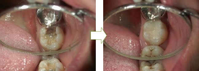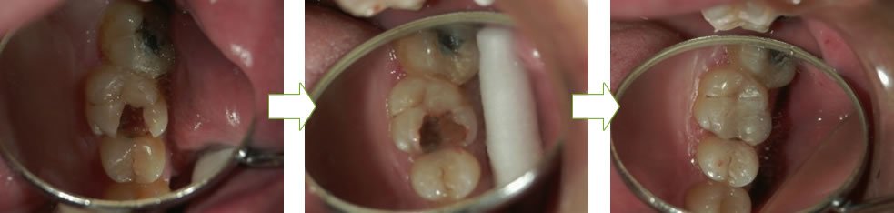 アメリカから輸入したミネラルを多く含むこのセメントを虫歯をわざと取り残し塗布し再生します。つまり薬で虫歯を治すというイメージでしょうか。