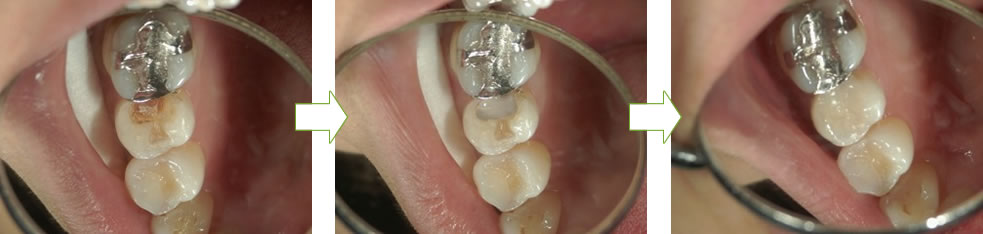 仕上げは樹脂を使い銀歯などの金属にもなりません。来院一度で一本の治療が終わります。